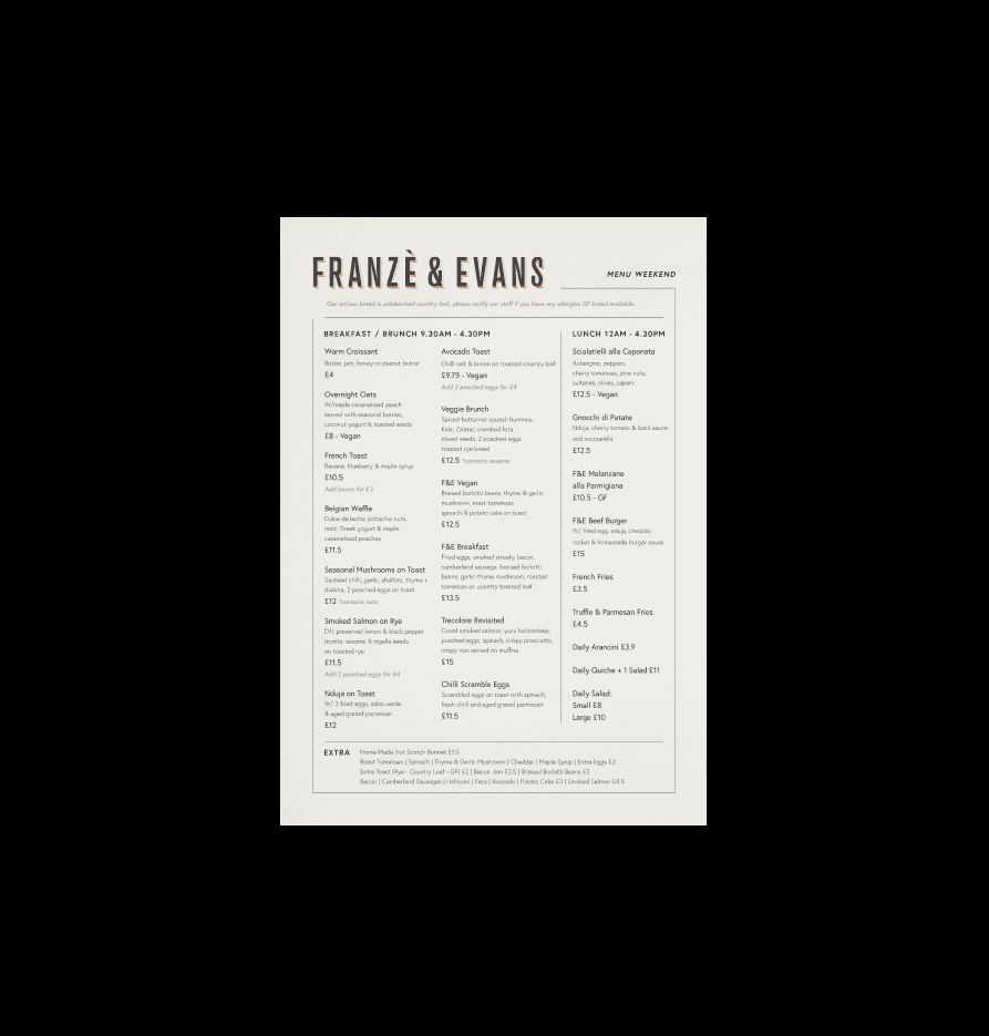 The branding of Franzè & Evans combines rustic charm with modern simplicity, reflecting its Italian-British culinary roots. A clean custom logo, warm neutral colors, and gentle contrasts create a welcoming and approachable feel. The visual identity is relaxed yet thoughtful, using simple layouts and natural textures to highlight the handmade quality of the food.